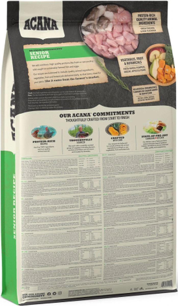 Acana Senior Dog 11,4 kgBereid in onze gecertificeerde keukens in Canada is ACANA SENIOR rijk aan lokaal gefokte scharrel kip, scharrel eieren, in het wild gevangen platvis, zongerijpt fruit en groenten – geleverd rijk aan voedingsstoffen en en smaak en beperkt in calorieën en koolhydraten zodat uw oudere hond in optimale fysieke conditie blijft.