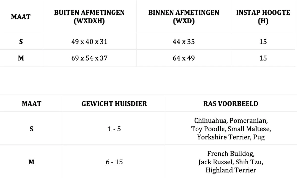 Maattabel boven tussen de productfotos