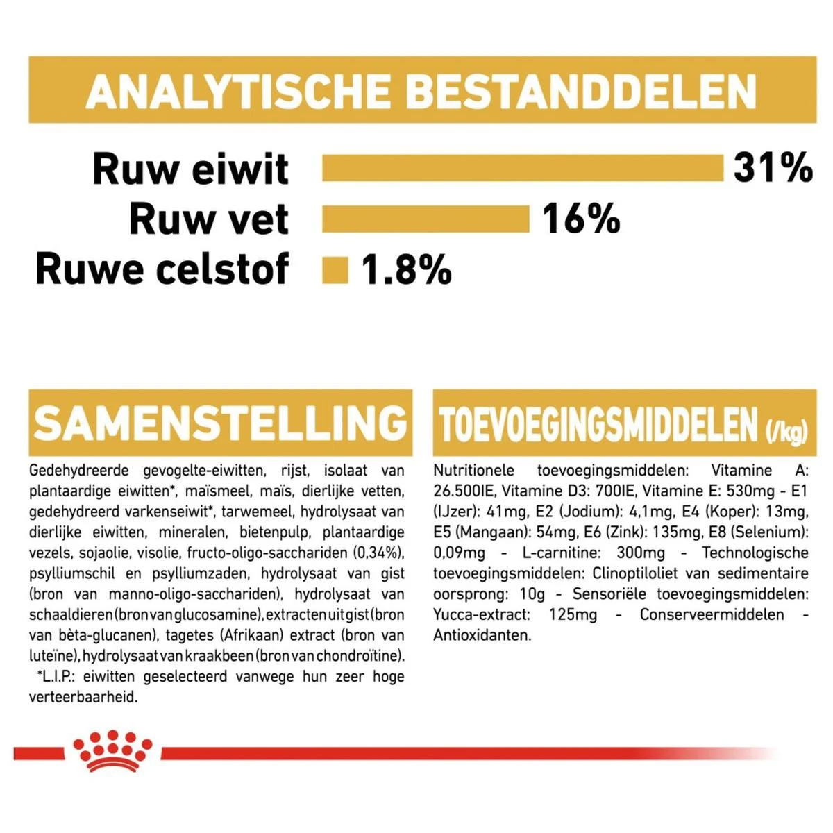 | Voedingswaarde | Samensteling: rijst, gedehydreerde gevogelte-eiwitten, isolaat van plantaardige eiwitten*, maïs, dierlijke vetten, gedehydreerd varkenseiwit*, hydrolysaat van dierlijke eiwitten, mineralen, bietenpulp, plantaardige vezels, sojaolie, visolie, psylliumschil en psylliumzaden, Fructo-Oligo-Sacchariden, hydrolysaat van gist (bron van Manno-Oligo-Sacchariden), hydrolysaat van schaaldieren (bron van glucosamine), tagetes (Afrikaan) extract (bron van luteïne), hydrolysaat van kraakbeen (bron van chondroïtine) |