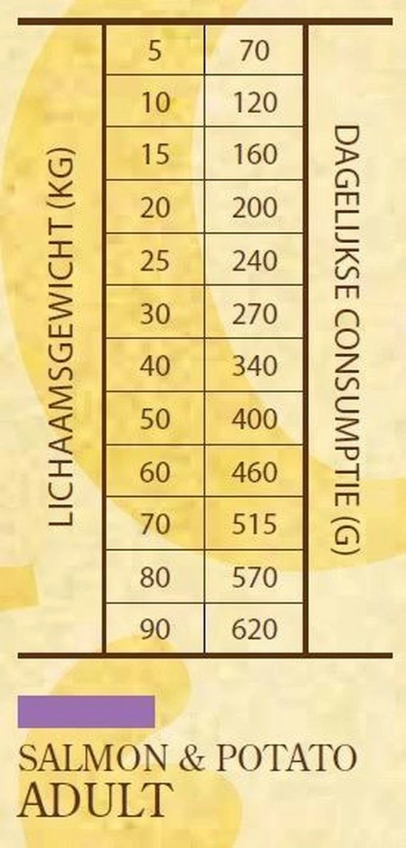 | Voedingswaarde | : 13 kg. Smaak: Zalm&Aardappel. Zalm, aardappel, mais, gevogeltevet (geconserveerd met gemengde tocoferolen, een bron van vitamine E) zalm olie, natuurlijke smaakstoffen, gedroogde appels, biergist, tomaten, yucca schidigera extract, wortelen, mineralen, DLmethionine, l-lysine, mannan-oligosachariden, fructo-oligosachariden, probiotica. |
